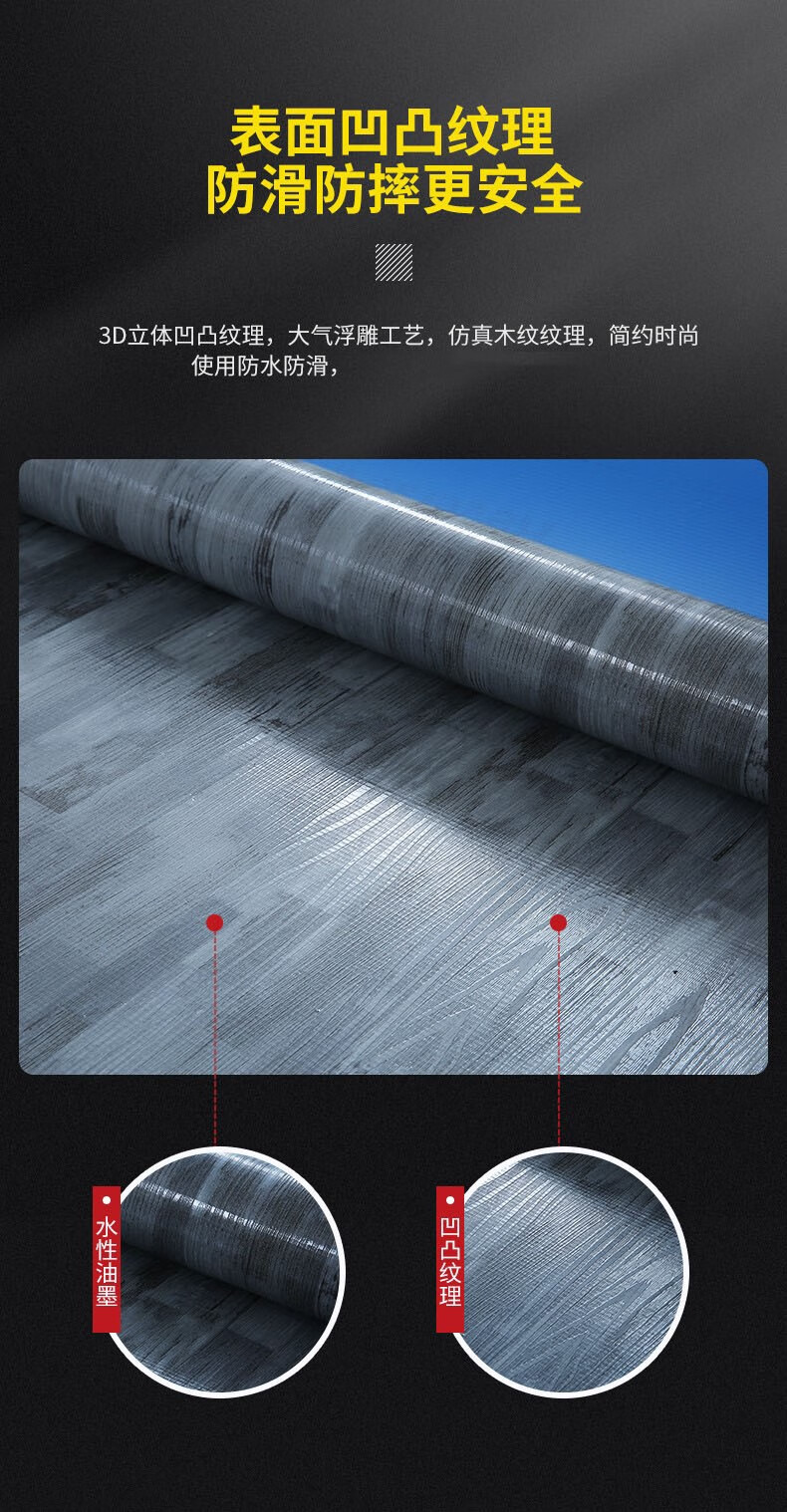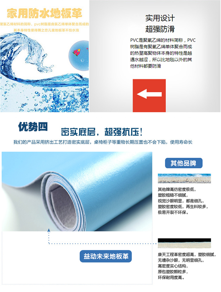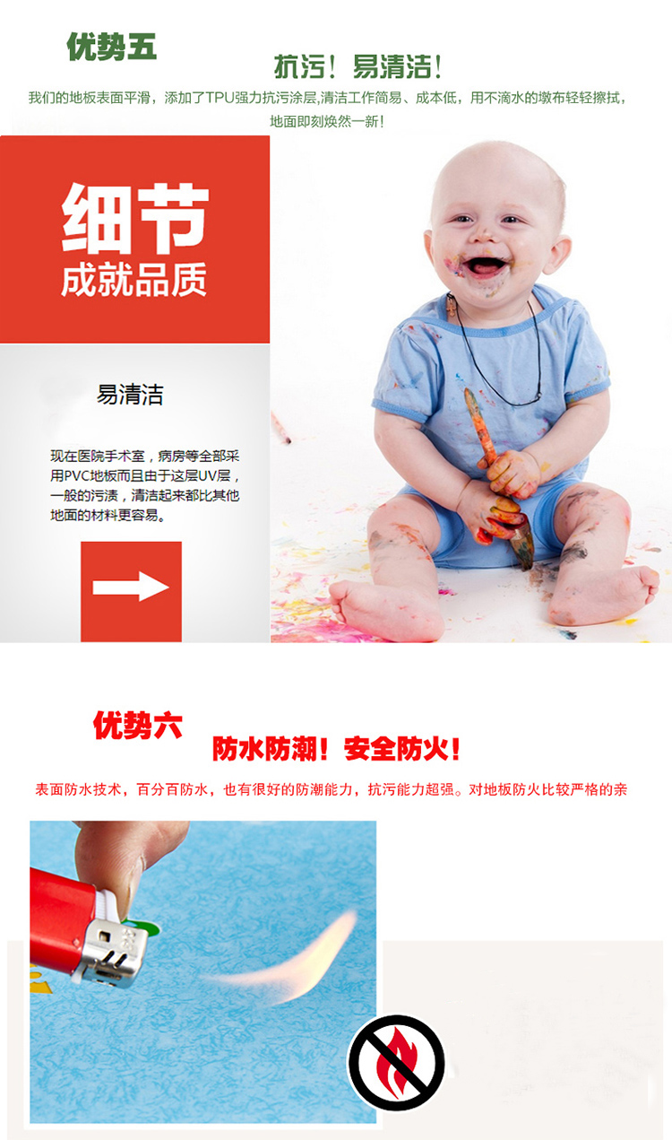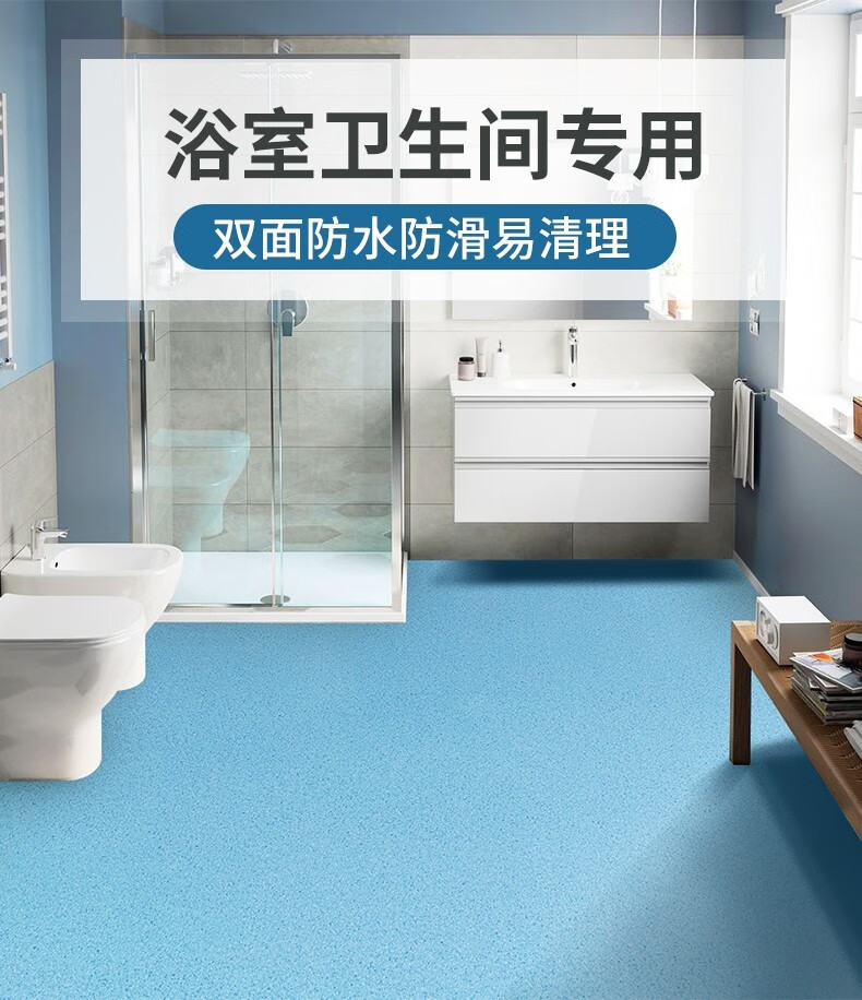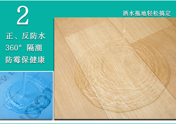 超强防滑:专用地胶的耐磨层有特殊的防滑性,而且与普通的地面材料相比,专用地胶在粘水的情况下脚感更涩,更不容易滑到,即越遇水越涩;