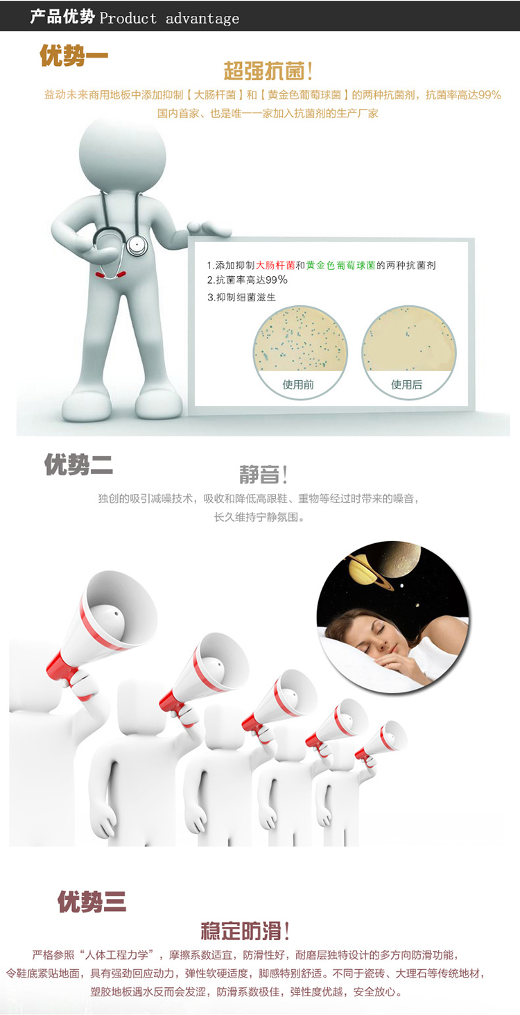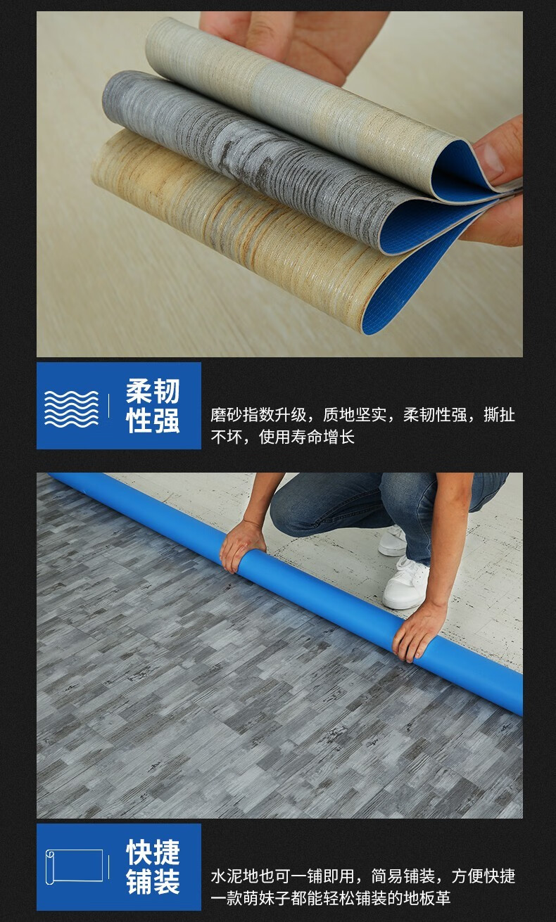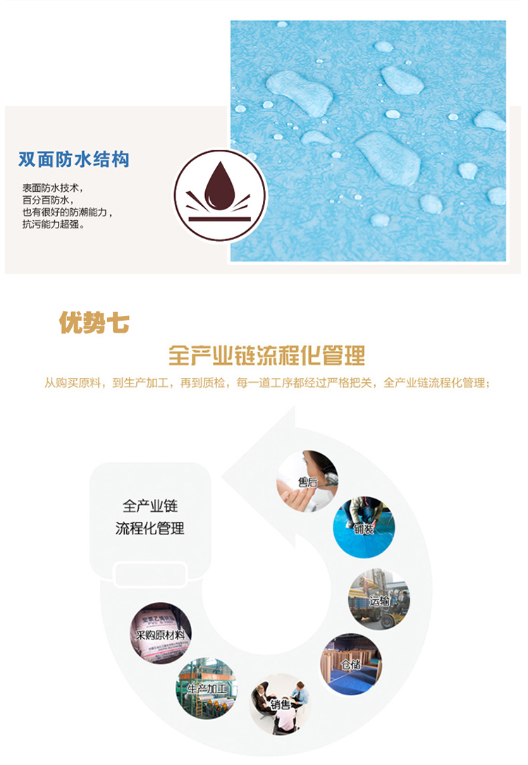 超强防滑:专用地胶的耐磨层有特殊的防滑性,而且与普通的地面材料相比,专用地胶在粘水的情况下脚感更涩,更不容易滑到,即越遇水越涩;