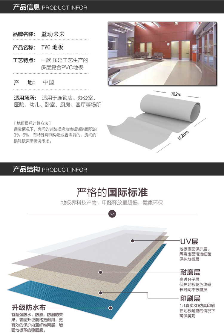 | 尺寸: | 1830mm*20m | 总厚度: | 2.0mm | 耐磨层: | 0.5mm |